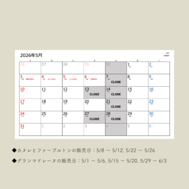 5月は下記を休業いたします 7日(木)、13日(水)、14日(木)、21日(木)、27日(水)、28日(木) ◆カヌレとフォーブルトンの販売日5/8 〜 5/12, 5/22 〜 5/26 ◆グランマドレーヌの販売日5/1 〜 5/6, 5/15 〜 […]