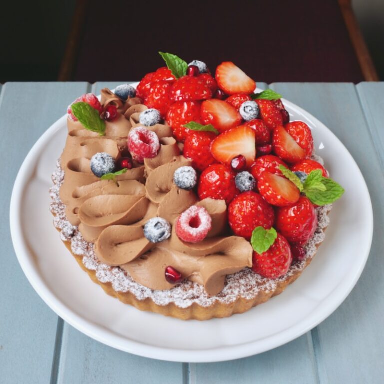 波の様に絞ったショコラクリームと旬の苺をたっぷり乗せた華やかな赤が綺麗な苺のタルト。