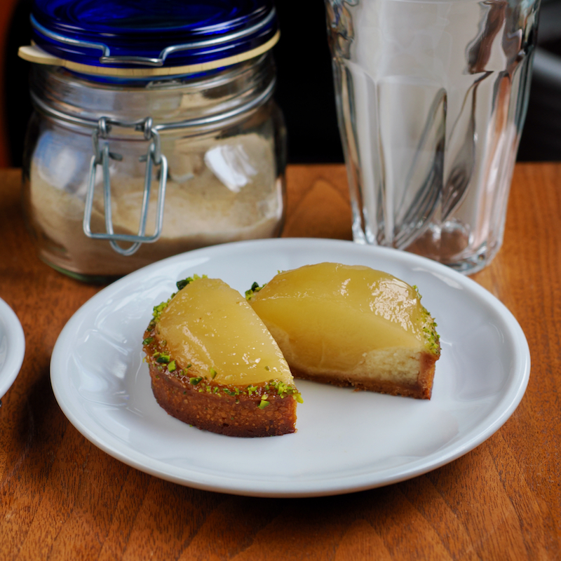 食べごろに追熟させたラ・フランス(洋梨)をリースリング(白ワイン)でコンポートして焼いたタルト・ポワール。
