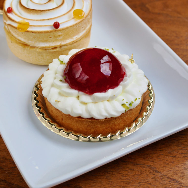 香ばしく焼き上げたタルトの上にフルーツのコンフィチュールを敷いて、花弁の様に絞った生クリームとドーム型のフルーツのジュレをデコレーション。