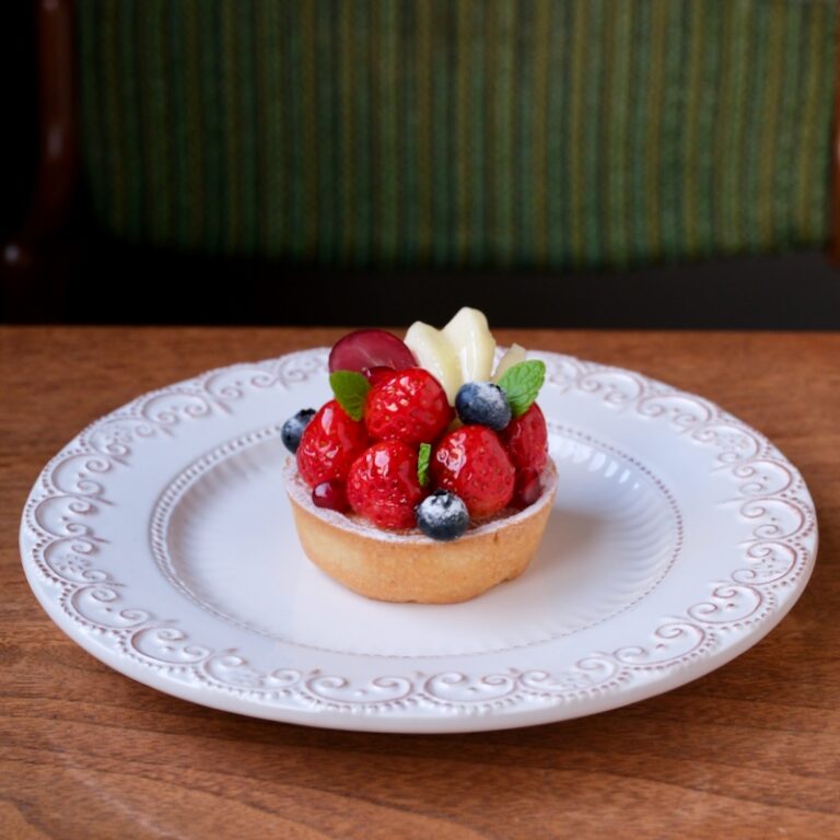 フランボワーズコンフィチュールを入れて焼いたタルトの上にカスタードクリームと生クリームを合わせた濃厚でリッチなディプロマットクリームを絞って、季節のフルーツを彩りよくデコレーションしました。